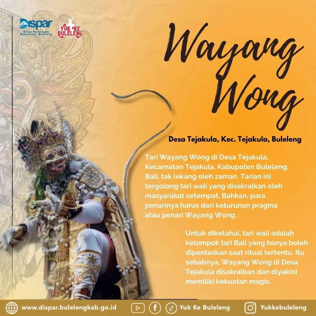 Apakah kalian sudah tahu salah satu tarian sakral yang kini masuk Warisan Budaya Dunia tak benda UNESCO? Ya benar! Wayang Wong. Kesenian asli asal Desa Tejakula, Kabupaten Buleleng ini merupakan tari sakral, dan bertahan karena dianggap mistis.