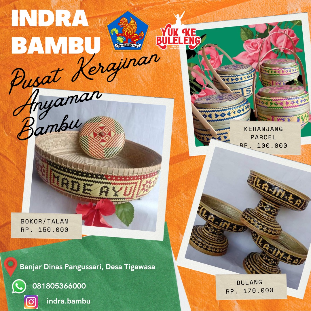 Salah satunya adalah produk anyaman bambu Pak Indra yang memiliki daya tarik yang tinggi bagi para pengunjung lokal maupun mancanegara dengan menyediakan beberapa model dan ukuran yang berbeda-beda dengan memperhatikan fungsionalitas produk, seperti misalnya tas keranjang yang dapat ditambahkan tulisan sesuai permintaan pembeli. Anyaman bambu Desa Tigawasa biasanya memiliki rongga anyaman yang lebih lebar dengan motif yang berbeda.