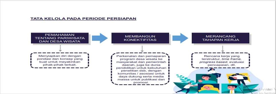 menyiapkan perijinan dan dokumen legalitas lembaga pengelola termasuk SDM, pelatihan dan pendampingan, sistem pengelolaan desa wisata dan lain –lain.