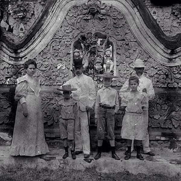 Keluarga Eropa berpose di Pura Beji Sangsit, Sawan, Buleleng , 1917. Pura Beji di Desa #Sangsit Kecamatan #Sawan, #Buleleng satu warisan peninggalan leluhur yg kini masih terjaga keasriannya. Sejak didirikan sekitar pada abad I5 silam pura ini memang di-empon oleh krama subak di desa setempat, namun dalam perjalanannya seluruh krama desa menjadi pengempon. Pura ini juga menjadi satu daya tarik wisata. Setiap hari ada saja wisatawan asing berkunjung ke pura ini. Konon, kunjungan wisatawan yg tak pernah sepi ini karena wisatawan tertarik mengetahui bahwa di pura tsb terdapat dua buah patung orang asing yg dikenali sbg warga Belanda. Satu patung memegang gitar dan satu lagi memegang rebab. Dua patung ini terletak di kori agung menuju ke jeroan pura. Tidak ada bukti tertulis yang memuat sejarah #Pura Beji. Kondisi ini membuat tokoh masyarakat di Sangsit menyusun buku yang menceritakan sejarah pura. Buku ini ditulis dengan narasumber dari pengelingsir yang mengetahui sejarah Pura Beji. Dari upaya itu terungkap bahwa Pura Beji sebenarnya bukan pura subak. Tetapi karena sejak didirikan sekitar abad 15 silam notabene krama di Sangsit merupakan petani, sehingga seolah-olah Pura Beji itu di-emong oleh krama subak saja. Sementara dari hasil penelitian menyebutkan bahwa berdasarkan tata letak pura itu sebelah utara komposisi pelinggihnya untuk krama subak, di tengah2 dibangun pelinggih yang masuk dalam kategori puseh dan di sebelah selatannya terdapat kelompok pelinggih jajaran. Ciri lainnya adanya bangunan Bale Agung Saka Kutus yg biasa terdapat pada Pura Puseh pada umumnya. Pura Beji dalam setahun melaksanakan tiga kali piodalan yang sudah terjadwal. Piodalan pertama jatuh tiap bulan Purnama Kedasa. Kedua digelar pada Purnama Desta. Piodalan ketiga atau sering disebut piodalan agung jatuh setiap Purnama Kapat.