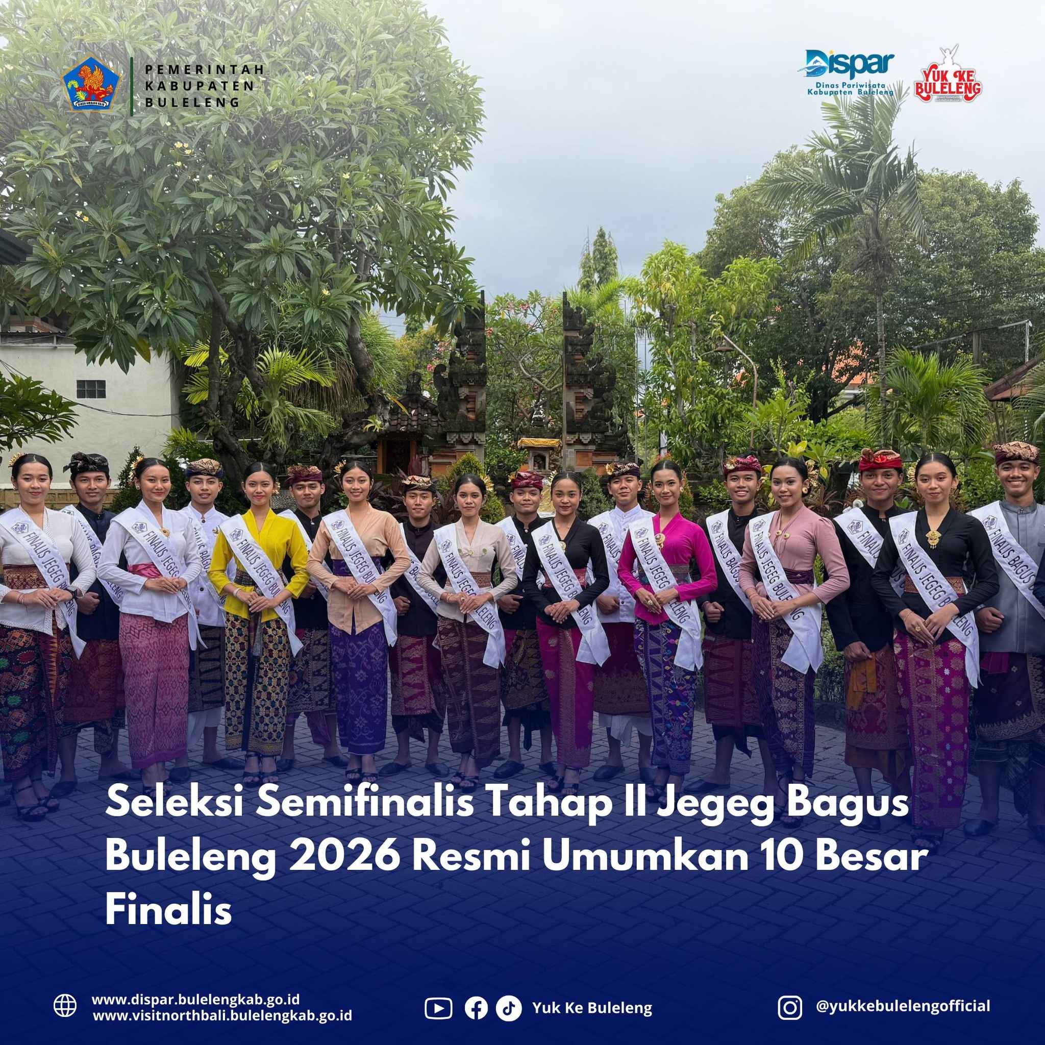Selamat kepada 10 pasang Finalis Jegeg Bagus Buleleng 2026. Semoga mampu memberikan kontribusi terbaik bagi kemajuan pariwisata Kabupaten Buleleng.
