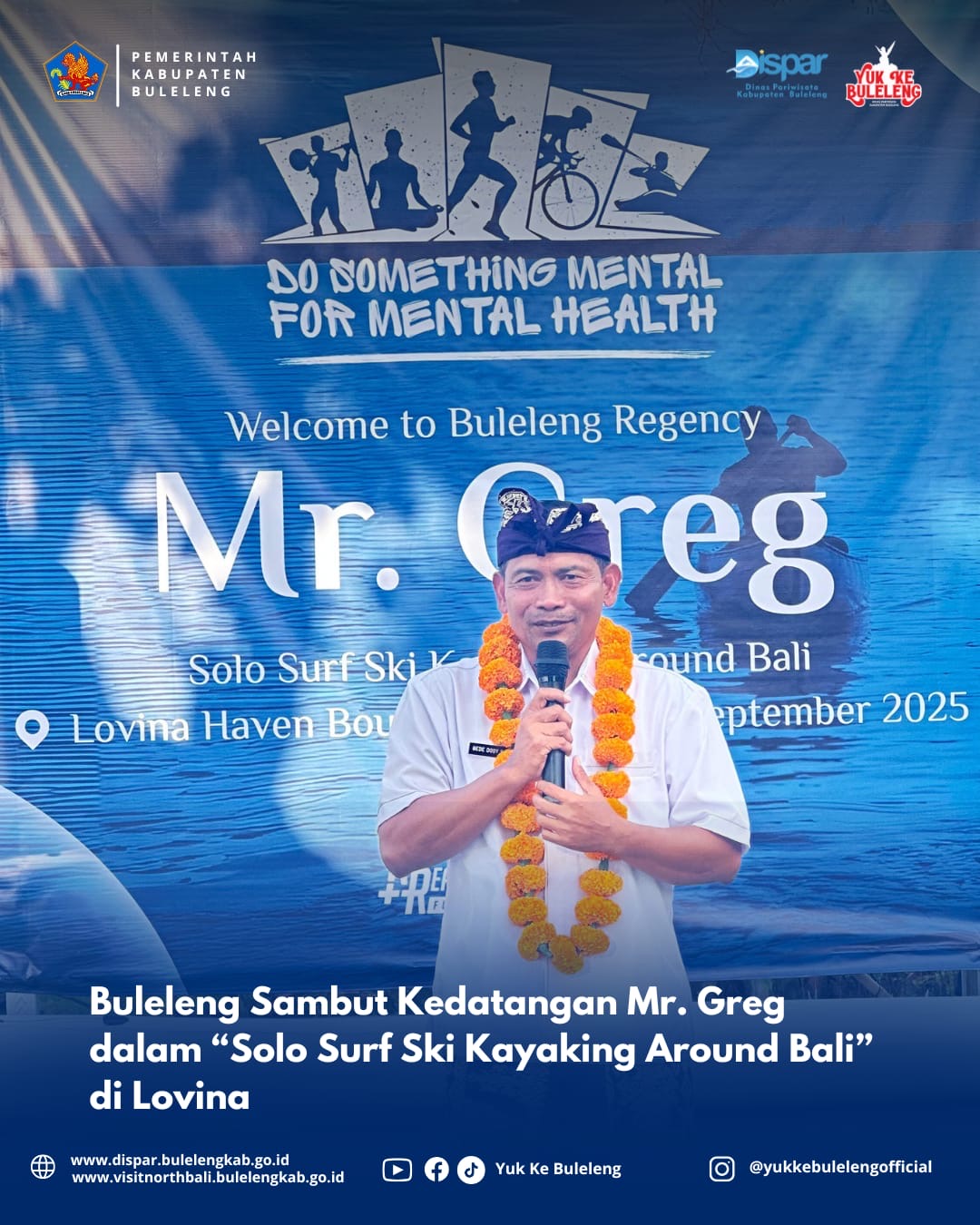 Lovina, 18 September 2025 – Suasana penuh semangat terasa di Lovina Haven Boutique Resort saat kedatangan olahragawan kayak internasional, Mr. Greg, dalam rangkaian kegiatan “Solo Surf Ski Kayaking Around Bali – EPIC 360 Route.” Bupati Buleleng, dr. I Nyoman Sutjidra, Sp.OG, melalui sambutan yang dibacakan oleh Kepala Dinas Pariwisata Kabupaten Buleleng, Gede Dody Sukma Oktiva Askara, menyampaikan bahwa merupakan suatu kebahagiaan dan kehormatan bagi Pemerintah Kabupaten Buleleng untuk menyambut langsung kedatangan seorang olahragawan yang luar biasa. Ia menegaskan bahwa kegiatan ini bukan hanya sekadar tantangan olahraga, tetapi juga sebuah misi mulia. Melalui rute EPIC 360, Mr. Greg tidak hanya menciptakan sensasi dengan mempromosikan keindahan pesisir pantai Bali, tetapi juga menggalang dana untuk layanan kesehatan mental gratis yang dikelola oleh Yayasan Bali Bersama Bisa, sebagai bentuk kepeduliannya terhadap isu kesehatan mental yang semakin penting.