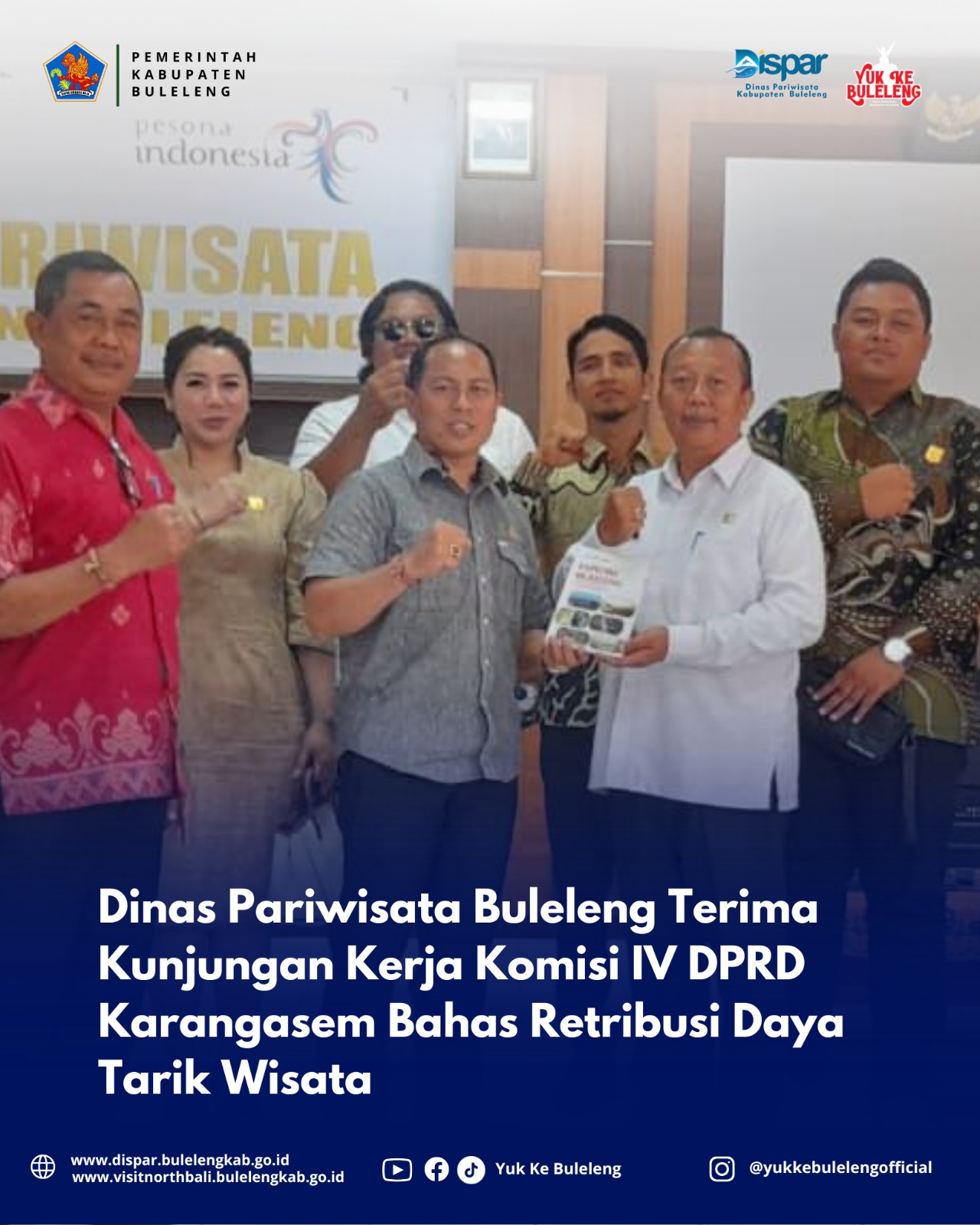 Buleleng, 5 Februari 2025 – Dinas Pariwisata Kabupaten Buleleng menerima kunjungan kerja dari Komisi IV DPRD Kabupaten Karangasem di ruang rapat Dinas Pariwisata Kabupaten Buleleng. Rombongan yang dipimpin oleh anggota Komisi IV ini diterima oleh Sekretaris Dinas Pariwisata dan Kepala Bidang Destinasi. Kunjungan ini bertujuan untuk melakukan sharing mengenai mekanisme retribusi daya tarik wisata (DTW) yang sudah diterapkan di Kabupaten Buleleng.