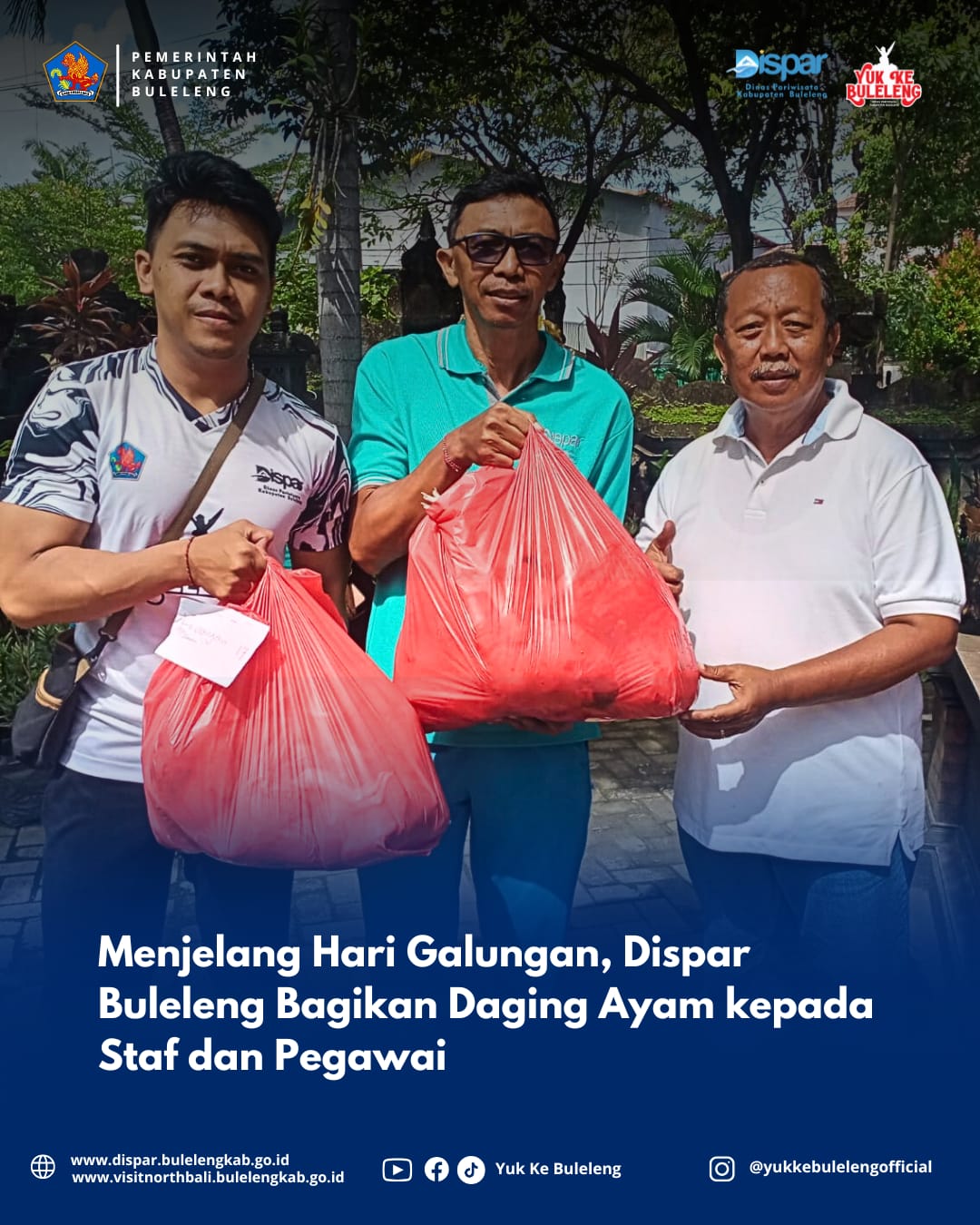 Sebanyak lebih dari 50 ekor ayam dibagikan kepada seluruh staf dan pegawai Dispar Buleleng. Selain sebagai bentuk apresiasi atas partisipasi dalam program, pembagian ini juga diharapkan bisa meringankan kebutuhan persiapan Hari Raya Galungan.