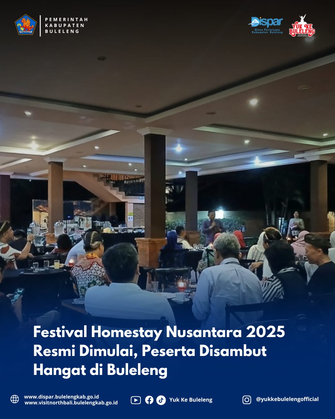 Buleleng, 23 Mei 2025 – Festival Homestay Nusantara 2025 resmi dimulai pada hari Jumat, 23 Mei 2025, dengan kegiatan penyambutan peserta dari berbagai daerah di Indonesia. Acara pembukaan ini berlangsung meriah di Krisna Kuliner Lovina, Buleleng, Bali, yang menjadi lokasi digelarnya welcoming dinner dan ramah tamah antara peserta dan panitia penyelenggara.