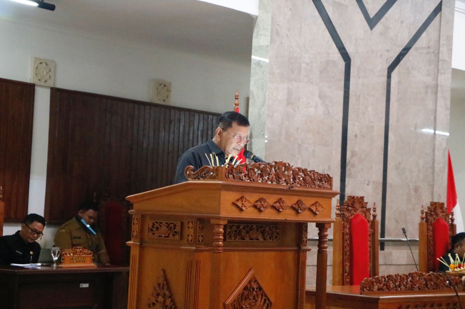 Sidang Paripurna dipimpin langsung oleh Ketua DPRD Kabupaten Buleleng dengan didampingi oleh Wakil Ketua DPRD Kabupaten Buleleng, serta turut hadir Bupati Buleleng, Sekda Kabupaten Buleleng, dan dihadiri para undangan dari Seluruh Pimpinan SKPD dilingkup Kabupaten Buleleng.