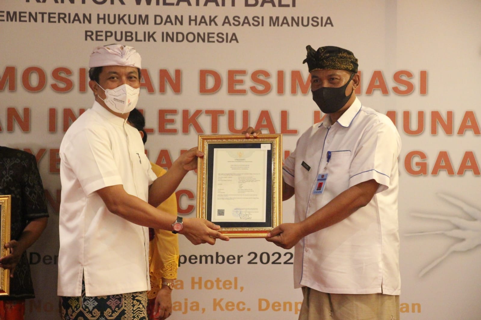 Kepala Bidang Sejarah dan Cagar Budaya mengikuti acara penyerahan sertifikat Pencatatan Inventarisasi Kekayaan Intelektual Komunal (KIK) dalam rangka perlindungan Ekspresi Budaya Tradisional (EBT) untuk Buleleng. Sertifikat diserahkan langsung Oleh Kepala Wilayah Provinsi Bali Kemenhukam RI kepada Kepala Bidang Sejarah dan Cagar Budaya yang mewakili Bapak Kadis di Hotel Prime Plaza - Sanur, Selasa (8/11).