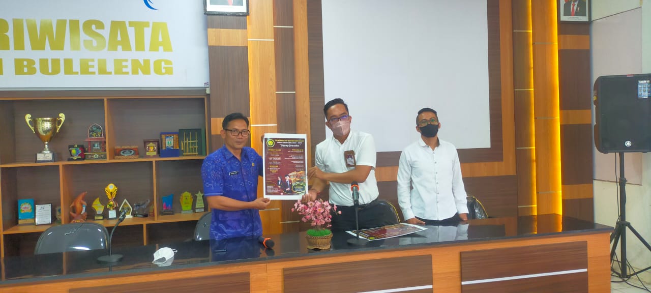 Kepala Dinas Pariwisata Kabupaten Buleleng Gede Doddy Sukma Oktiva Askara,Sos,M.Si menerima dari STAHN Mpu Kuturan Singaraja, Bapak Wiramarta selaku koordinator melaksanakan Sosialisai Pendaftaran dan Prodi Program STAH N MPU Kuturan Singaraja tahun akademik 2022 - 2023.