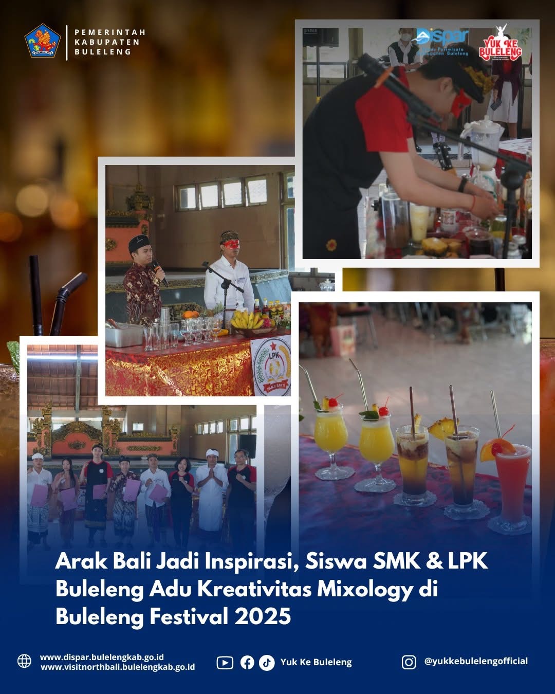 Singaraja, 20 Agustus 2025 — Suasana semarak tampak di Gedung Wanita Laksmi Graha Singaraja pada Rabu (20/8) pagi. Beberapa siswa dari SMK dan Lembaga Pelatihan Kerja (LPK) di Buleleng ikut ambil bagian dalam Lomba dan Workshop Mixology Arak Bali yang digelar oleh Dinas Pariwisata Kabupaten Buleleng bersama LPK Panji Sakti Singaraja.