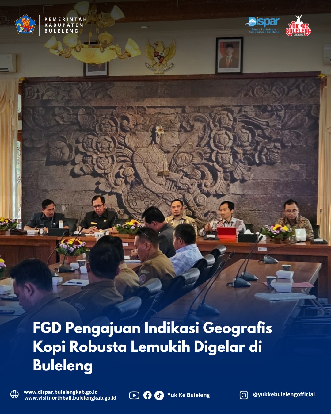 Dinas Pariwisata Kabupaten Buleleng menggelar kegiatan Focus Group Discussion (FGD) dalam rangka pendampingan pengajuan Indikasi Geografis (IG) untuk Kopi Robusta Lemukih. Acara ini dilaksanakan pada pukul 08.00 WITA, bertempat di Ruang Rapat Rumah Jabatan Bupati Buleleng.