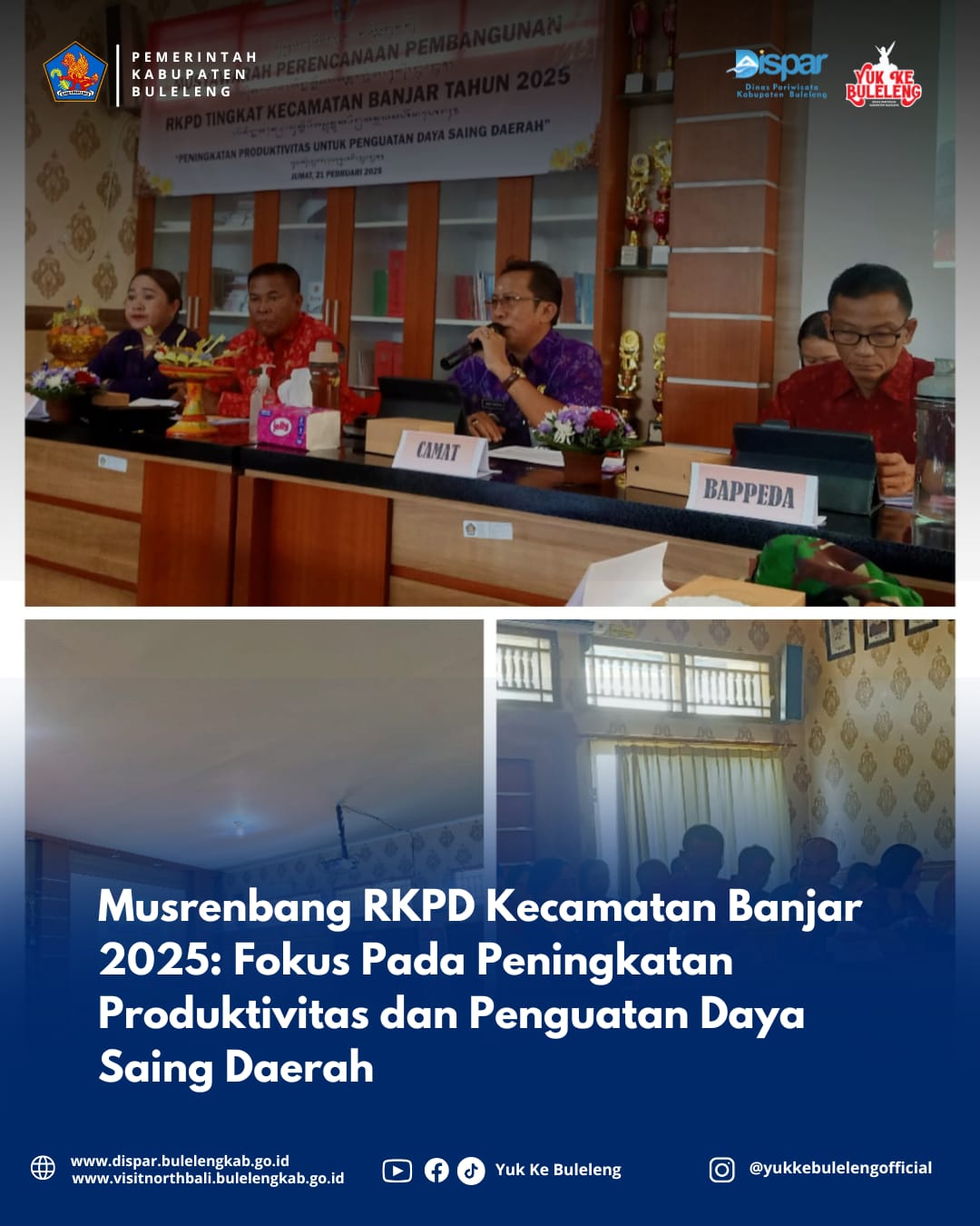 Banjar, 21 Februari 2025 – Dinas Pariwisata Kabupaten Buleleng melalui perwakilannya menghadiri kegiatan Musyawarah Perencanaan Pembangunan (Musrenbang) Rencana Kerja Pemerintah Daerah (RKPD) Kecamatan Banjar Tahun 2025 yang berlangsung pada Jumat, 21 Februari 2025 dengan tema "Peningkatan Produktivitas Untuk Penguatan Daya Saing Daerah",