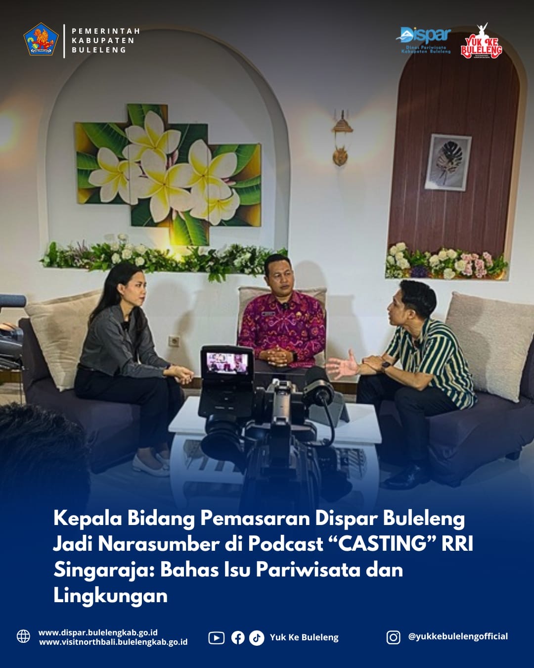 Singaraja – Kepala Bidang Pemasaran Dinas Pariwisata Kabupaten Buleleng, Agus Widya Suputra, S.E., MAP., didampingi Runner Up Jegeg Bagus Buleleng tahun 2024, Komang Ratna Dewi, hadir sebagai narasumber dalam program podcast RRI Singaraja bertajuk “CASTING” (Podcast Penting Gak Penting), pada Senin (14/4). Dalam kesempatan tersebut, Agus membahas berbagai isu strategis seputar pariwisata dan lingkungan hidup yang menjadi perhatian penting bagi perkembangan sektor pariwisata di Buleleng.