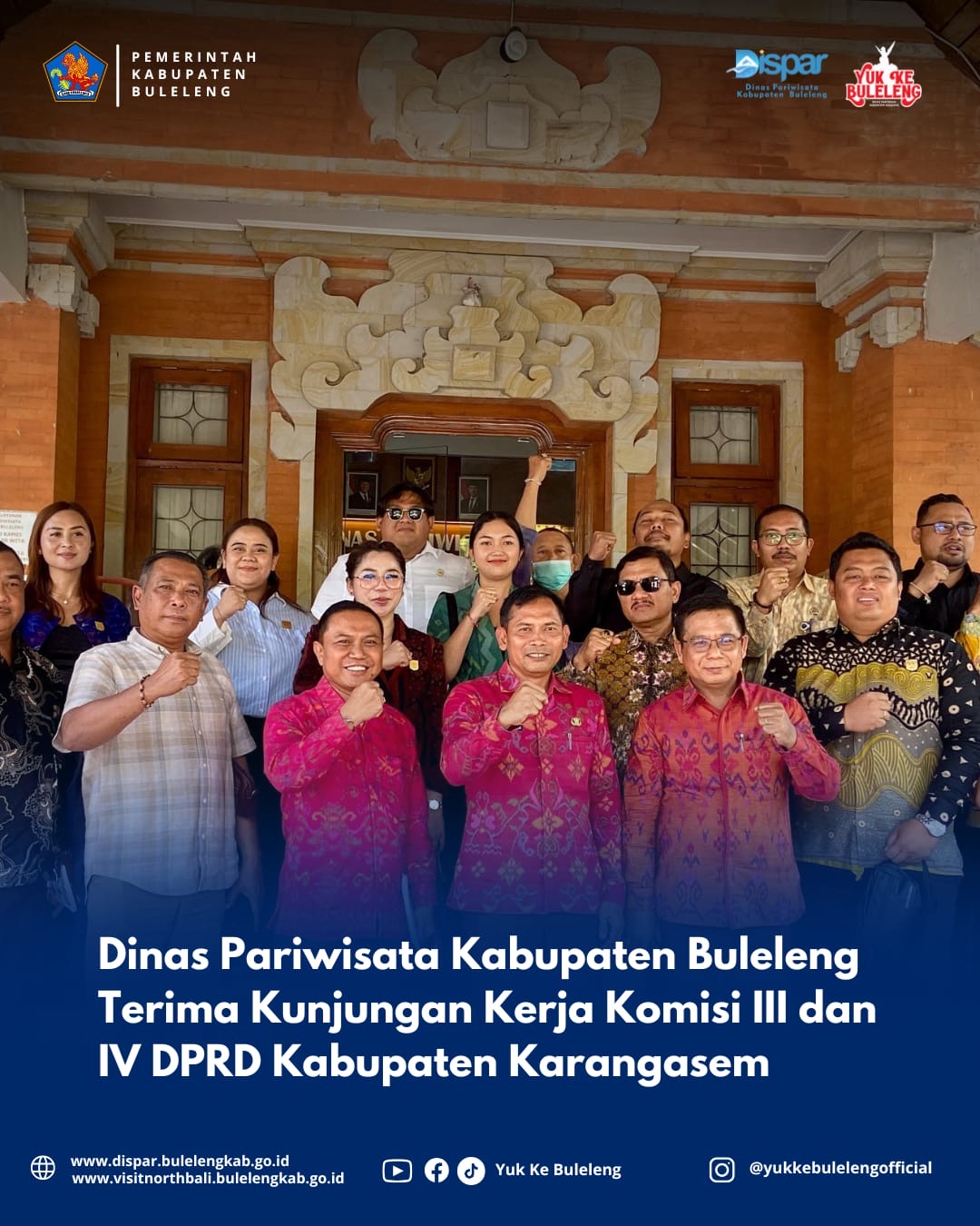 Buleleng, 25 Maret 2025 – Dinas Pariwisata Kabupaten Buleleng menerima kunjungan kerja dari Komisi III dan Komisi IV DPRD Kabupaten Karangasem di ruang rapat Dinas Pariwisata Kabupaten Buleleng. Rombongan yang dipimpin oleh Ketua Komisi III ini diterima langsung oleh Kepala Dinas Pariwisata, Gede Dody Sukma Oktiva Askara, S.Sos, M.Si, bersama Kepala Bidang Destinasi, Kepala Bidang Sumber Daya Pariwisata, serta Kepala Bidang Penagihan Pajak dari BPKPD Kabupaten Buleleng.