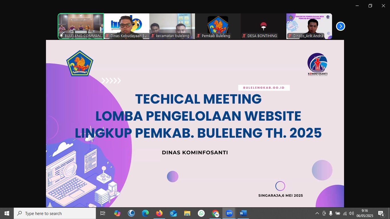 Dimana pada kali ini dilaksanakan Technical Meeting lomba website melalui zoom meeting. Pada kesempatan kali ini Dinas Kebudayaan Kabupaten Buleleng hadir TM diwakili oleh Pengelolaannya Website Dinas. TM dibuka langsung oleh Kepala Dinas Komunikasi, Informatika, Persandian dan Statistik Kabupaten Buleleng, yang didampingi oleh Para dewan juri serta dihadiri oleh para undangan dari SKPD dan BUMN di Lingkup Kabupaten Buleleng.