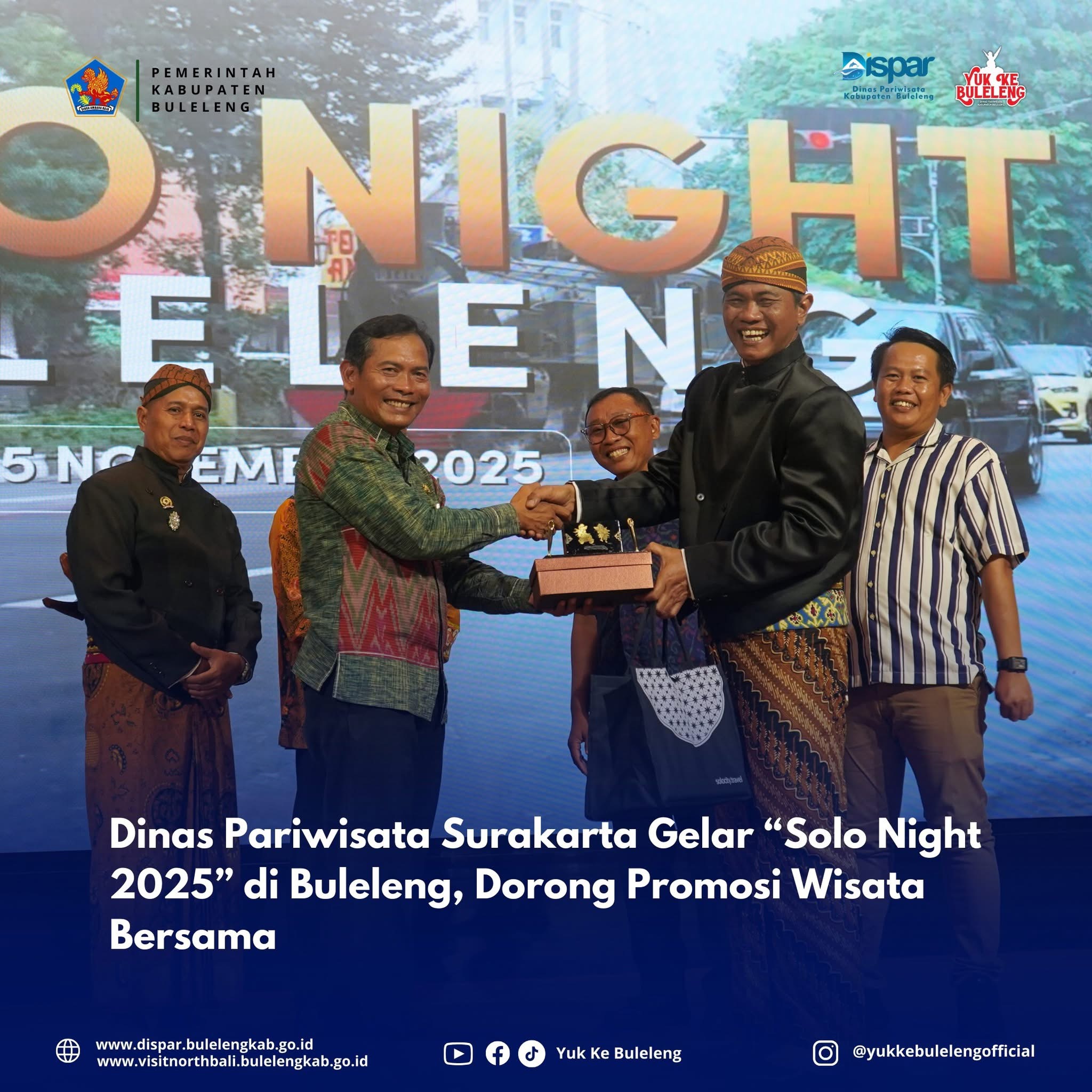 Sementara itu, Kepala Dinas Pariwisata Kabupaten Buleleng, Gede Dody Suksma Oktiva Askara, S.Sos., M.Si., menyambut baik terselenggaranya kegiatan ini. Menurutnya, “Solo Night 2025” merupakan bentuk sinergi positif antara Kota Surakarta dan Kabupaten Buleleng dalam upaya membangun sektor pariwisata dan ekonomi kreatif, sehingga arah promosi dapat berjalan lebih efektif dan berkelanjutan.