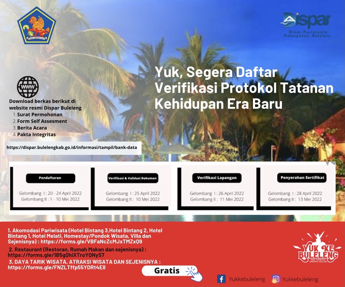 Dalam rangka Peningkatan Daya Saing Usaha Pariwisata melalui penerapan aspek kebersihan, kesehatan, keamanan, dan kelestarian lingkungan yang memadai. Dinas Pariwisata Kabupaten Buleleng memfasilitasi penerbitan sertifikat Protokol Tatanan Kehidupan Era Baru (PTKEB) Tanun 2022. Alur pendaftaran PTKEB sebagai berikut :
