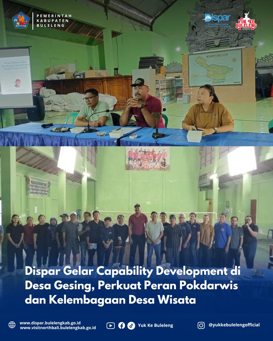 Buleleng, 19 September 2025 – Desa Gesing, Kecamatan Banjar, Kabupaten Buleleng, menjadi tuan rumah kegiatan Capability Development Desa Gesing yang berlangsung pada Jumat (19/9) di Gedung Serbaguna Kantor Desa Gesing. Kegiatan yang digelar mulai pukul 09.00 hingga 13.00 WITA ini diikuti oleh berbagai unsur penting, mulai dari Pemerintah Desa Gesing beserta jajarannya, BUMDes, Kelompok Sadar Wisata (Pokdarwis), pelaku usaha pariwisata, PKK, UMKM, narasumber, hingga perwakilan dari Bidang Sumber Daya Pariwisata Dinas Pariwisata Kabupaten Buleleng.