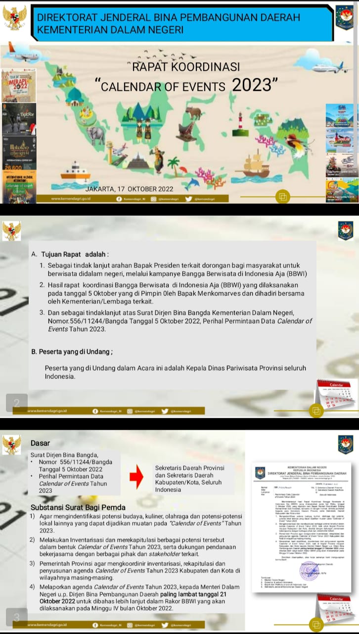 Dibuka oleh Kepala Direktorat Bina Pembangunan Daerah Kementerian Dalam Negeri yang dalam hal ini diwakili oleh Ditjen Bangda, Bambang Budiono selain membahas permintaan data Calendar of Event 2023 juga membahas terkait arahan dari Presiden RI tentang akan diadakannya kampanye " BANGGA BERWISATA DI INDONESIA AJA ".