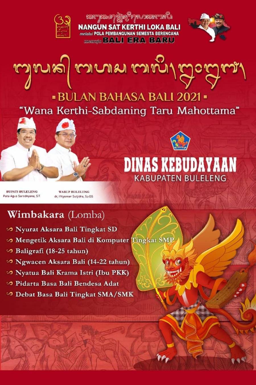 Serangkaian dengan kegiatan Bulan Bahasa Bali 2021 sebagai bentuk pemuliaan terhadap bahasa,aksara dan sastra bali. Bulan bahasa bali pada tahun 2021 ini mengandung tema Wana Kerthi-Sabdaning Taru Mahottama yang bermakna Bulan Bahasa Bali sebagai Altar Pemuliaan Bahasa, Aksara, dan Sastra Bali terkait Jelajah Pemaknaan Hutan sebagai prana kehidupan. Mengingat kembali bahwa pandemi covid19 belum berakhir pada tahun ini maka pelaksanaan lomba diadakan secara daring dan luring untuk mencegah adanya penyebaran Covid-19. Pelaksanaan daring akan dilaksanakan pada lomba Baligrafi dan Mesatua Bali yang dilaksanakan di masing-masing Kecamatan pada tanggal 05 Februari 2021 dan pelaksanaan luring akan dilaksanakan pada lomba debat di SMA Negeri 1 Singaraja, Nyurat di SDN 3 Banjar, Mengetik Aksara di Komputer di SMP 1 Singaraja dan Ngewacen di Sasana Budaya. Pelaksanaan Lomba Luring dilaksanakan serentak pada tanggal 08 Februari 2021 dan dengan tempat yang berbeda untuk menghindari adanya keramaian. Sedangkan pelaksanaan lomba Daring peserta akan mengirimkan link video yang sudah diupload ke youtube masing-masing.
