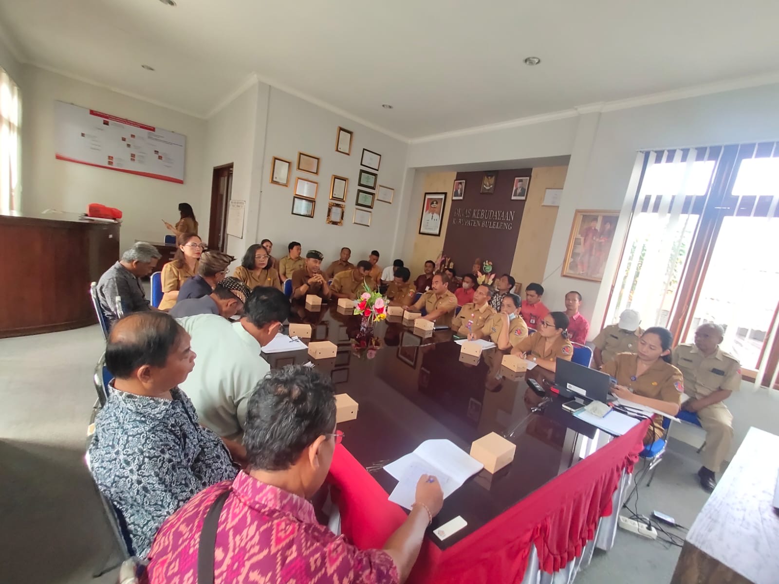 Rapat dibuka oleh Kepala Dinas Kebudayaan Buleleng yang didampingi Kepala Bidang Sejarah dan Cagar Budaya, Kepala UPTD Gedong Kirtya danPlt.Kasubag TU serta dihadiri oleh Perwakilan Kecamatan se-kabupaten Buleleng dan Dewan Juri Bulan Bahasa Bali beserta staff UPTD Gedong Kirtya.