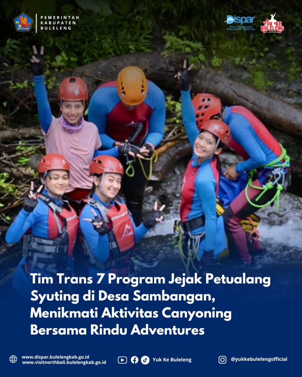 Buleleng, 9 Februari 2025 – Tim program Jejak Petualang dari Trans 7 baru-baru ini melakukan syuting di Desa Sambangan, Kabupaten Buleleng. Kegiatan ini mengambil lokasi di salah satu desa yang terkenal dengan keindahan alamnya dan beragam potensi wisata alam yang menantang. Dalam kesempatan kali ini, tim melakukan aktivitas Canyoning, yang didukung oleh Rindu Adventures.