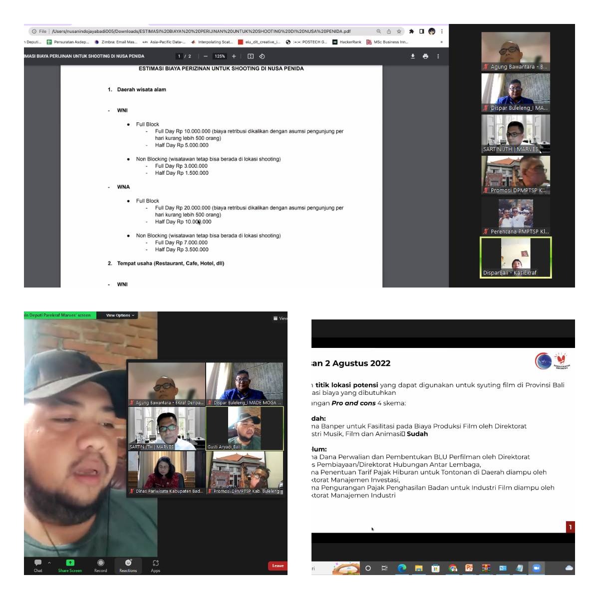 pada pukul 13.00 Wita. Dinas Pariwisata yang dalam hal ini diikuti oleh Analis Pariwiata Dinas Pariwisata Kabupaten Buleleng, dengan dihadiri oleh Kemenkomarves, Kemeparekraf, Kemendikbud, Kemenkeu, Dispar Prov Bali, Dispar Kab/Kota Se-Bali, DPMPPTSP Se-Bali dan Seluruh pelaku Perfilman Bali.