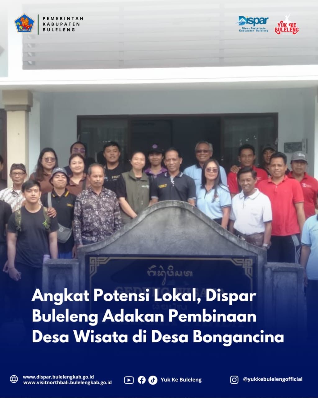Bongancina, 7 February 2025 – Dinas Pariwisata Kabupaten Buleleng melalui Bidang Sumber Daya Pariwisata melaksanakan pembinaan Desa Wisata dan pengoptimalan Pokdarwis (Kelompok Sadar Wisata) di Desa Bongancina, Kecamatan Busungbiu, Kabupaten Buleleng. Kegiatan ini dipimpin oleh Kepala Dinas pariwisata kabupaten Buleleng dalam hal ini di wakilkan oleh Kepala Bidang Sumber Daya Pariwisata, Kadek Mila Pradnyani, S.S., M.AP. Beserta staf dan dihadiri oleh Perbekel Bongancina, Ketua Pokdarwis,di dampingi stake Holder di desa dan sejumlah pengurus Pokdarwis serta masyarakat setempat.