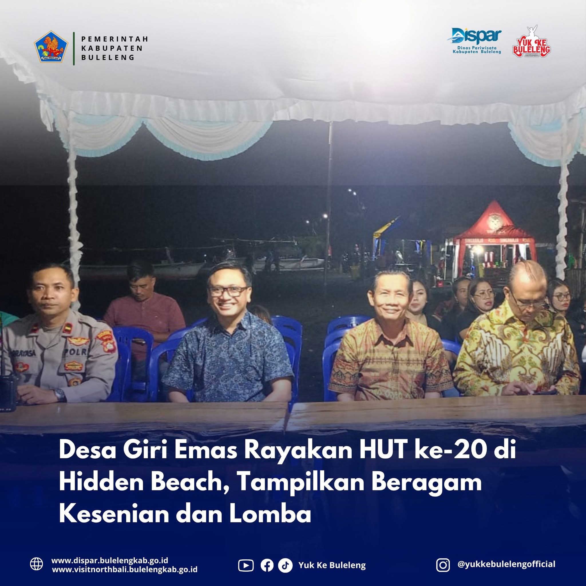 Jumat, 14 November 2025 - Sekretaris Dinas Pariwisata Kabupaten Buleleng, Ariston Adhi Pamungkas, S.P., M.Env.Man, menghadiri pembukaan peringatan HUT Desa Giri Emas ke-20 di Pantai Hidden Beach, Desa Giri Emas. Acara akan dilaksanakan selama 3 hari mulai hari Jumat hingga Minggu (16/11/2025) dengan berbagai agenda kesenian dan lomba. Hadir Camat Sawan, Kelian Adat Sangsit Dangin Yeh, Perbekel Giri Emas, Dirtek PDAM, Dispar, Kapolsek Sawan, Danramil Sawan, Forkom Perbekel dan tamu undangan lainnya.