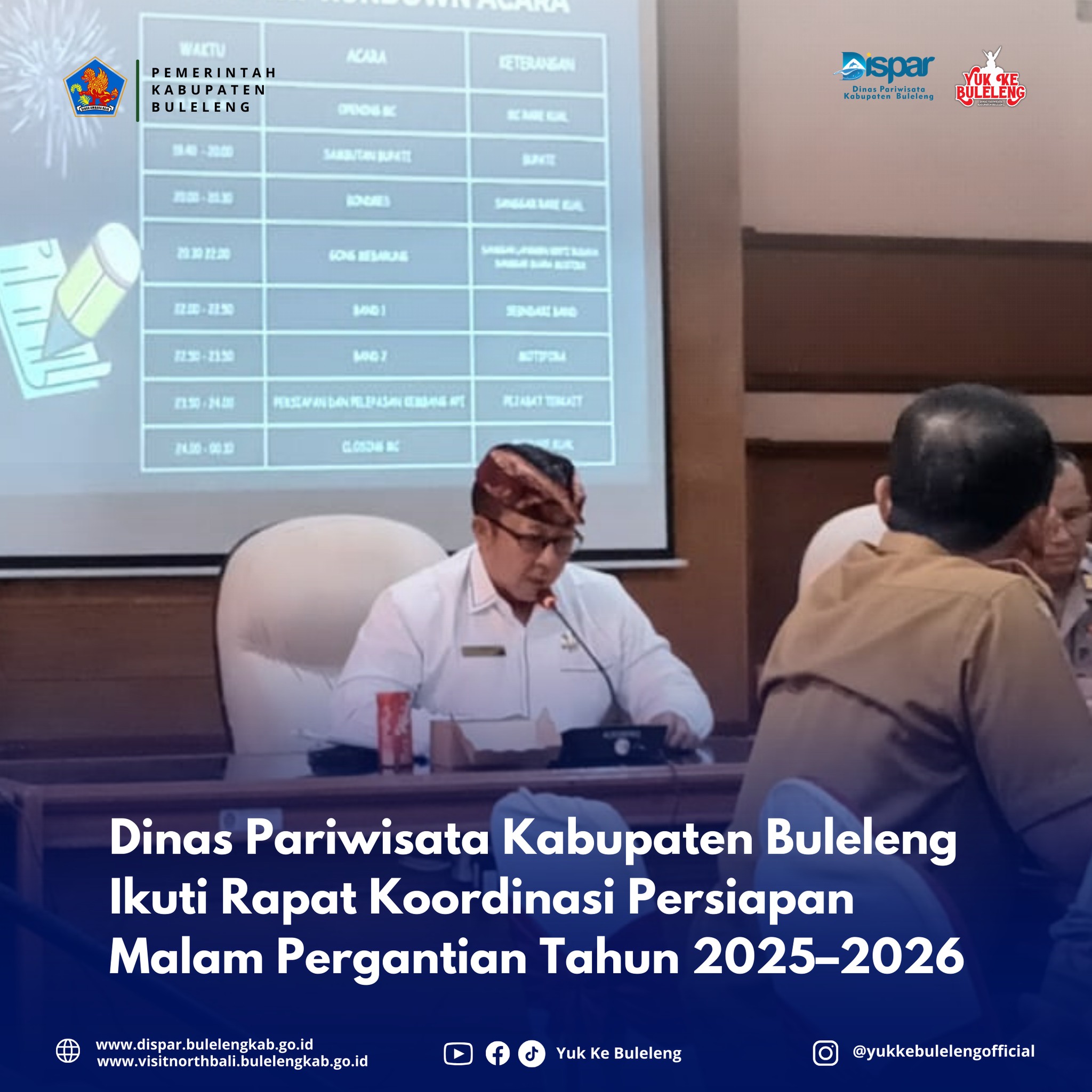 yang bertempat di Gedung Unit IV. Rapat tersebut diikuti oleh Putu Aristya Wibawa, SH., yang hadir mewakili Kepala Dinas Pariwisata Kabupaten Buleleng serta Kepala Bidang Destinasi, sebagai bentuk dukungan dan keterlibatan aktif Dinas Pariwisata dalam menyukseskan kegiatan akhir tahun.
