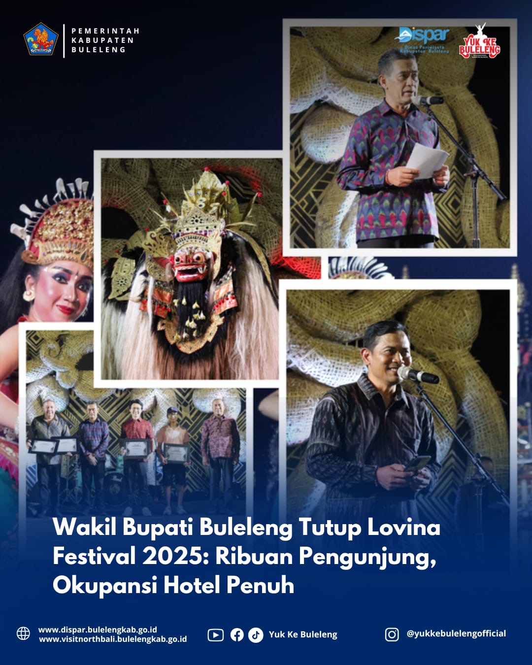 Kaliasem – Minggu, 27 Juli 2025 Wakil Bupati Buleleng, Gede Supriatna, S.H. secara resmi menutup rangkaian Lovina Festival 2025 yang berlangsung meriah di kawasan wisata Kaliasem. Dalam sambutannya, Wabup Supriatna menyampaikan bahwa Lovina Festival memberikan dampak positif bagi sektor pariwisata di Buleleng, sekaligus menjadi ruang strategis bagi pelaku UMKM lokal dalam mempromosikan dan menjajakan produk kepada wisatawan, baik domestik maupun mancanegara.