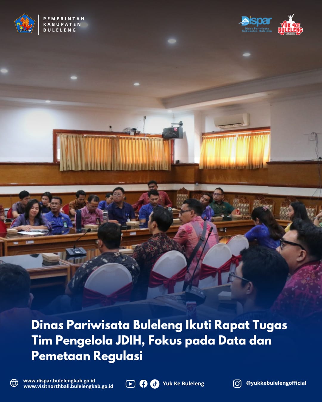 Buleleng, 2 September 2025 – Bertempat di Gedung Unit IV Lantai II Kantor Bupati Buleleng, perwakilan anggota Jaringan Dokumentasi dan Informasi Hukum (JDIH) dari Dinas Pariwisata Kabupaten Buleleng mengikuti agenda rapat pembahasan tugas sebagai Tim Pengelola JDIH. Kegiatan ini merupakan bagian dari upaya penguatan koordinasi dan optimalisasi pengelolaan dokumen hukum di lingkungan Pemerintah Kabupaten Buleleng.