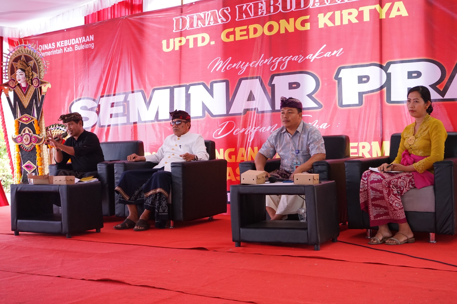 Seminar kali ini dibuka secara resmi oleh Kepala Dinas Kabupten Buleleng Drs. I Nyoman Wisandika, yang di dampingi oleh Ketua Panitia Kepala Bidang Cagar dan Budaya Ir. Nyoman Widarma, kesempatan kali ini acara seminar hadir Narasumber yaitu Dr. Drs. I Ketut Supir M.Hum , M.Hum dan I Gusti Bagus Sudiasta, SMSP,(Budayawan) yang akan memaparkan materi tentang PRASI dengan tema “Keberlangsungan dan Kebermanfaatan Seni Prasi di Era Milenial” kegiatan Seminar dilaksanakan pada jam 09.00 Wita s/d selesai.