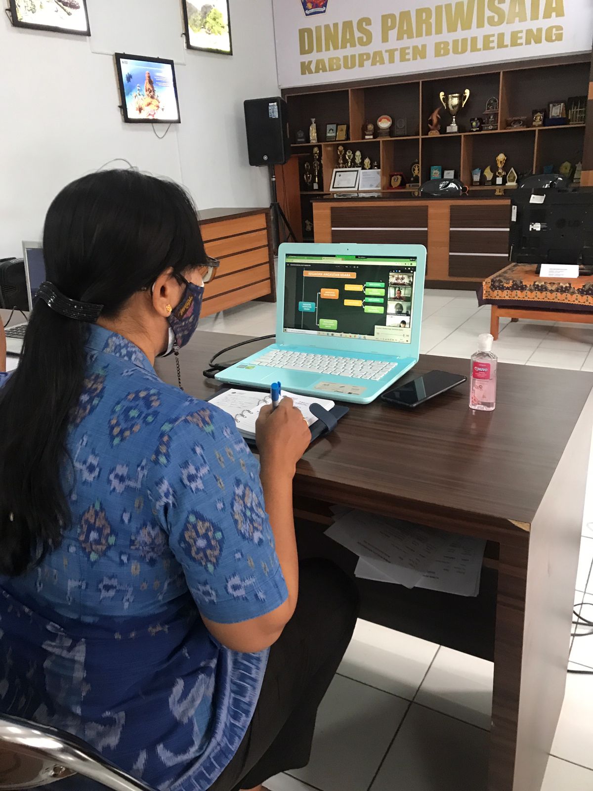 Kepala dinas pariwisata nkabupaten buleleng dalam hal ini diwakilkan oleh Kabid Industri Pariwisata Putu Suryani SS. Melaksanakan rapat virtual melalui zoom meeting dalam rangka membahas isu terkait kepariwisataan bali, khususnya upaya pemulihan pariwisata bali, di ruang rapat dinas pariwisata kabupaten buleleng didampingi Staf ASN bidang industri