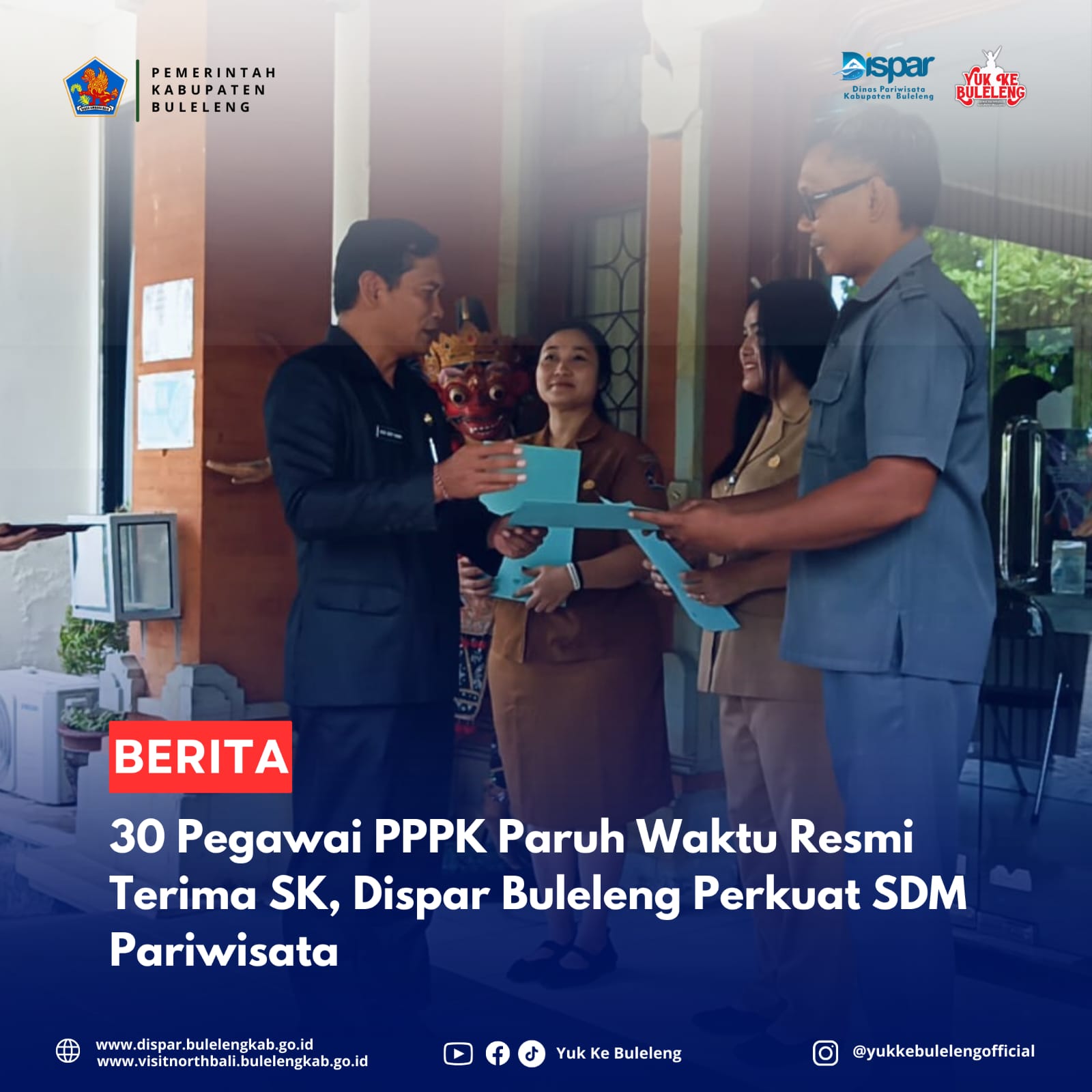 Buleleng 24 Nopember 2025 – Dinas Pariwisata Kabupaten Buleleng hari ini melaksanakan penyerahan Surat Keputusan (SK) Pegawai Pemerintah dengan Perjanjian Kerja (PPPK) Paruh Waktu. Sebanyak 30 orang pegawai di lingkungan Dinas Pariwisata Buleleng secara resmi menerima SK mereka dalam sebuah upacara simbolis yang digelar di Halaman Kantor Dinas Pariwisata Kabupaten Buleleng.