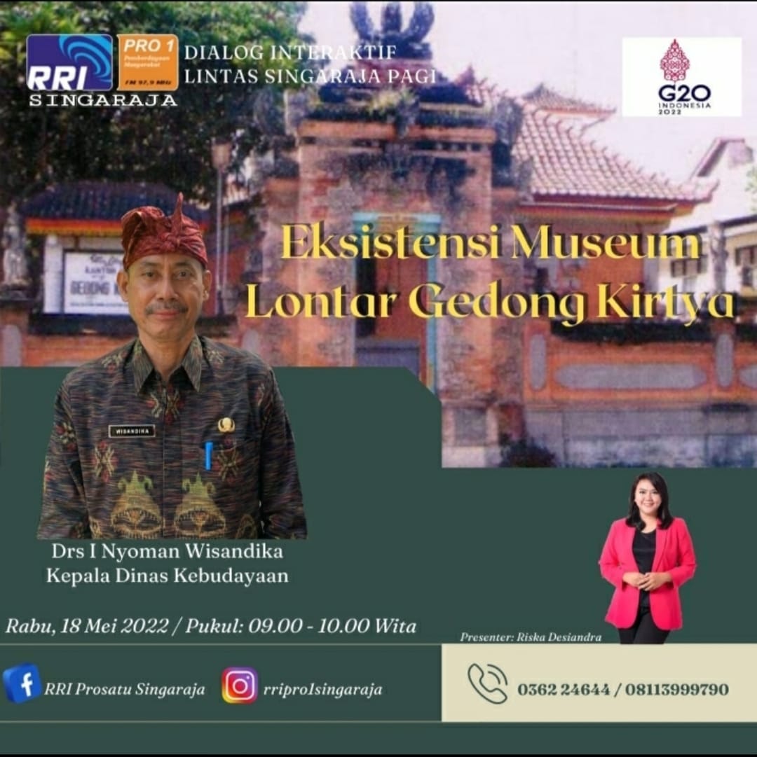 Kepala Dinas Kebudayaan Kabupaten Buleleng I Nyoman Wisandika didampingi oleh Kepala UPTD Gedong Kirtya Dewa Ayu Putu Susilawati mengisi acara Dialog Interaktif lintas singaraja pagi yang diadakan dan disiarkan oleh PRO 1 RRI Singaraja FM 97,9 MHz. Dialog interaktif dilaksanakan pada Rabu, 18 Mei 2022 mulai dari pukul 9 sampai dengan 10 pagi. Pada dialog interaktif ini mengangkat tema Eksistensi Museum Lontar Gedong Kirtya. Kepala Dinas Kebudayaan pun memaparkan program-program kegiatan Gedong Kirtya yang sudah berjalan maupun yang belum berjalan atau masih dalam rencana. Salah satu program Gedong Kirtya yaitu Belajar Bersama Museum dengan tujuan memperkenalkan koleksi lontar yang ada di perpustakaan Gedong Kirtya. Kegiatan Belajar Bersama Museum sudah pernah terlaksana di beberapa sekolah di Kabupaten Buleleng. Program kedepan Belajar Bersama Museum rencana akan dipusatkan di tiap Kecamatan yang ada di Kabupaten Buleleng yang tentunya dapat menjangkau masyarakat tentang lontar-lontar yang ada di Buleleng. Masyarakat Buleleng yang memiliki koleksi atau warisan lontar di rumahnya yang bisa dikonsultasikan langsung pada kegiatan Belajar Bersama Museum.