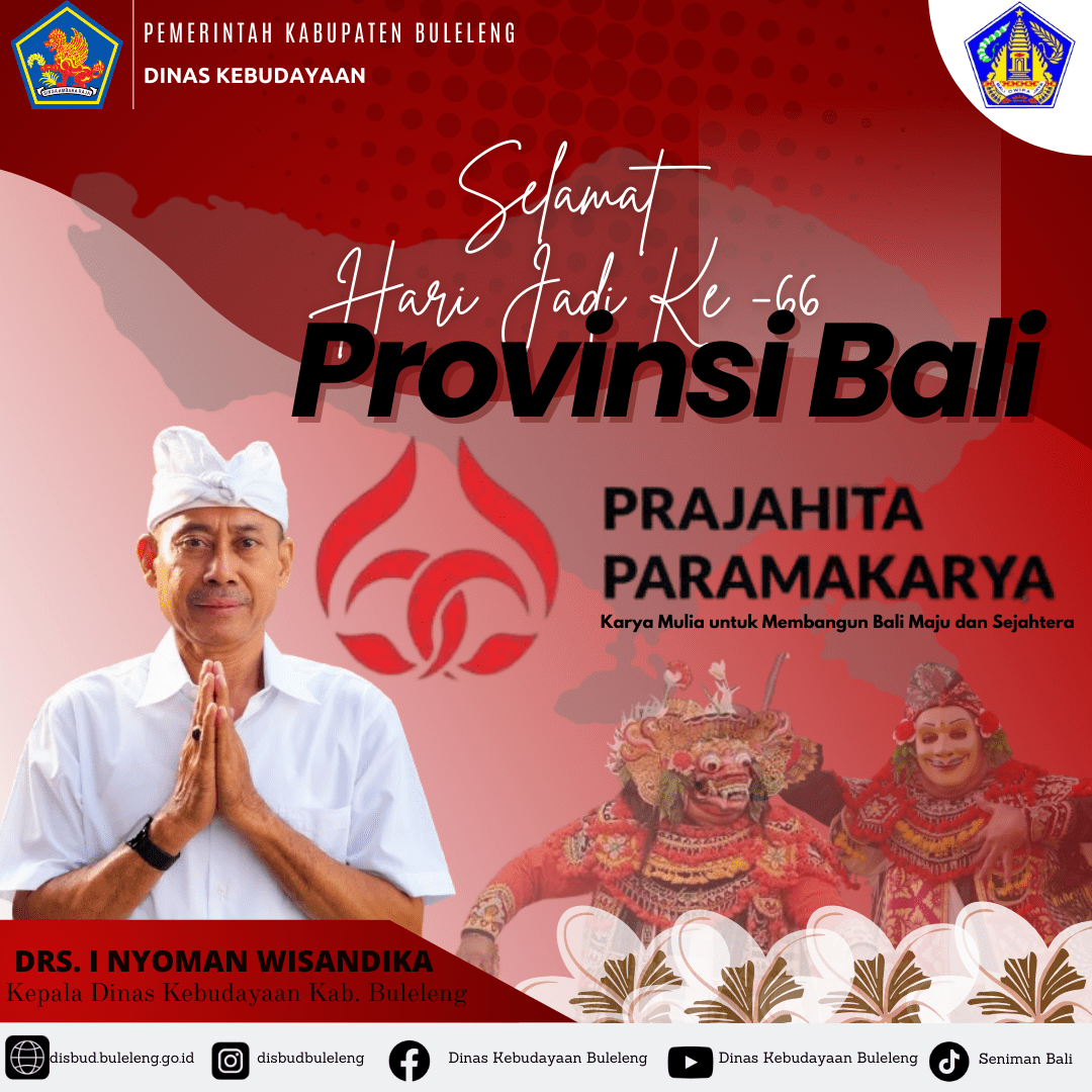 Segenap Keluarga Besar Dinas Kebudayaan Kabupaten Buleleng mengucapkan Selamat Hari Jadi Provinsi Bali yang Ke-66 “PRAJAHITA PARAMAKARYA” (Karya Mulia Untuk Membangun Bali Maju dan Sejahtera), Rabu (14/8/2024)