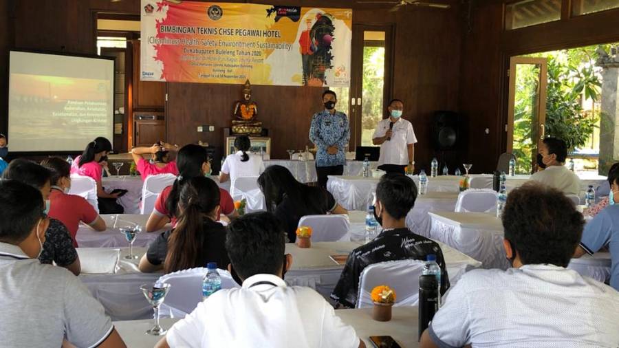 Hari kedua kegiatan Bimbingan Teknis CHSES Pegawai Hotel bertempat di Puri Bagus Lovina Resort yang dilaksanakan oleh Seksi Pengembangan dan Peningkatan Sumber Daya Pariwisata Dinas Pariwisata Kabupaten Buleleng dengan narasumber dari PHRI I Gede Sukayasa dengan materi Panduan Pelaksanaan CHSED di Hotel