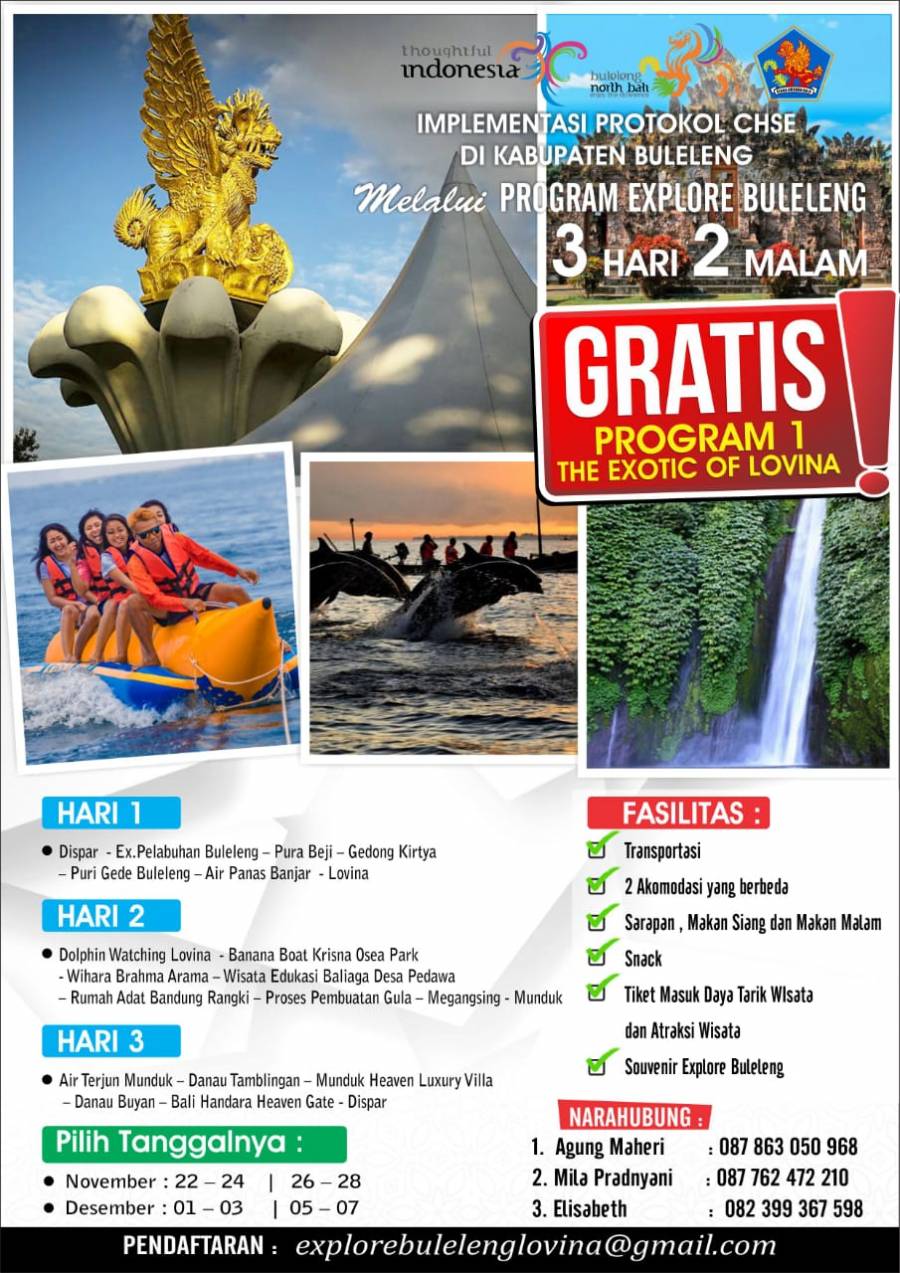 Halo Semeton Buleleng, Dinas Pariwisata Kabupaten Buleleng mengajak semeton sami untuk “Explore Buleleng” lewat 3 program trip perjalanan selama 3 hari 2 malam GRATIS yang ditawarkan untuk pengalaman berwisata di Buleleng. Kegiatan ini bertujuan untuk mendukung penerapan Implementasi Protokol CHSE di Buleleng.