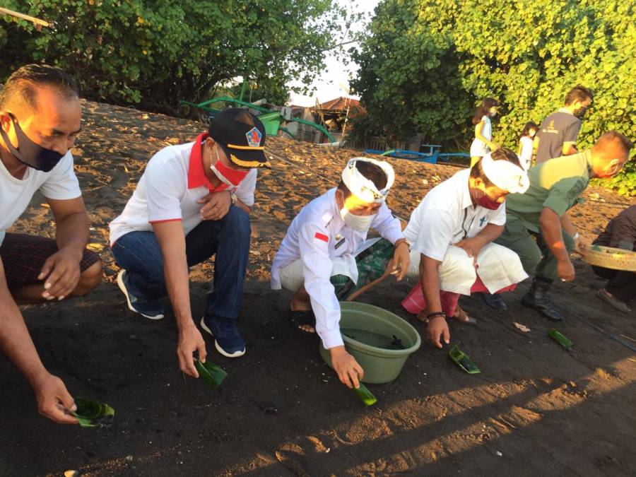 Kepala Dinas Pariwisata Made Sudama Diana,S.Sos,MM bersama sama melepas liarkan 150 ekor tukik hasil budi daya tradisional dari masyarakat di pantai Desa Kalianget untuk pertama kalinya dilaksanakan.