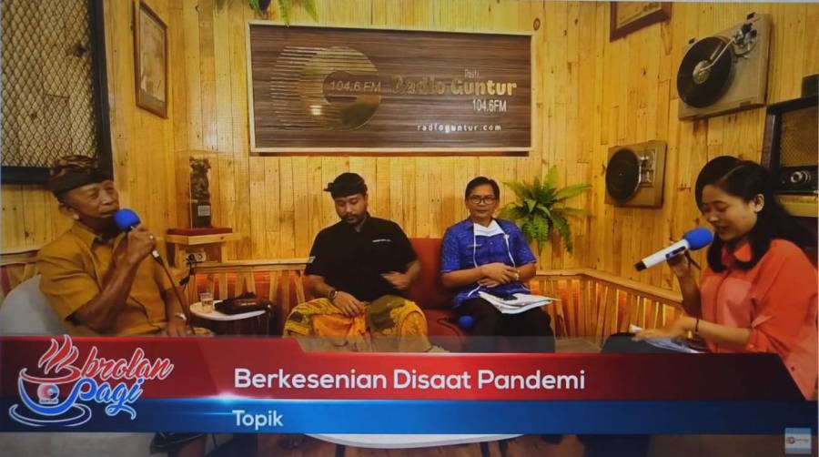 Selama situasi pandemi ini walaupun sudah memasuki masa new normal tetapi tetap saja tidak ada habisnya untuk dibicarakan. Seperti halnya di bidang kesenian yang selama pandemi covid19 para seniman pun ikut terkena dampaknya yaitu tidak dapat menari atau melaksanakan pementasan sebagaimana biasanya. Membicarakan soal seni dalam kondisi seperti saat ini, radio guntur pun mengundang beberapa narasumber diantaranya Kepala Dinas Kebudayaan Kabupaten Buleleng Gede Dody Sukma Oktiva Askara, S.Sos, M.Si, Ketua Listibya Kabupaten Buleleng Gede Marayana dan salah satu seniman Pande Gede Satria Kusuma Yudha untuk mengetahui bagaimana pendapat mereka ketika masa pandemi covid19 ini mengekang para seniman dalam berkesenian. Dijelaskan menurut seniman Bapak Pande, selama pandemi covid19 para seniman sama halnya seperti sekolah-sekolah, sanggar-sanggar seni yang terdapat di Kabupaten Buleleng juga ditutup sementara untuk dapat memutus rantai penyebaran virus covid19 atau bisa dikatakan lockdown. Tetapi memasuk masa new normal seperti sekarang ini para seniman perlahan mulai bangkit untuk berkesenian kembali tetapi dengan tetap mematuhi protokol kesehatan. Bapak Pande pun sudah mulai merasa lega karena memasuki masa new normal sudah mulai perlahan mendapat tawaran pementasan setelah sekian lama libur, "Astungkara sudah mulai mekenyem", katanya. Bapak Pande juga mengatakan, pementasan selama masa new normal pun dilakukan secara daring seperti halnya sekolah-sekolah yang melaksanakan pembelajaran secara daring. Dimana pementasan ini dilaksanakan di rumah saja yang nantinya hasil dari pementasan tersebut akan ditampilkan di media sosial.