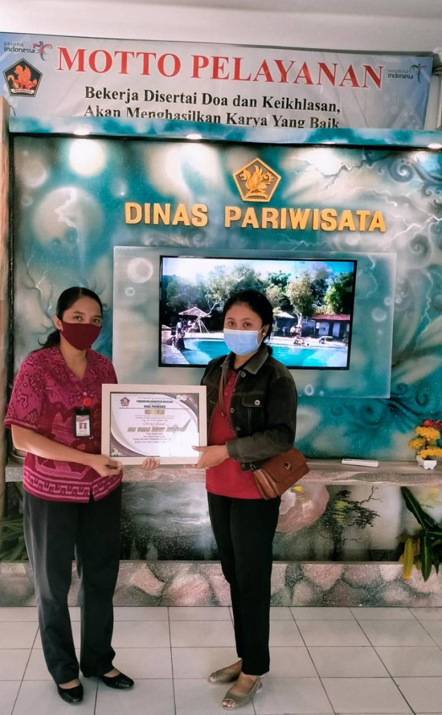 Giat Dispar selasa 21 Juli 2020 Buleleng melakukan penyerahan Sertifikat Protokol Tatanan Kehidupan Era Baru oleh Dinas Pariwisata Kabupaten Buleleng yang diwakili oleh Kasi Pelayanan dan Informasi Pariwisata Ibu Elisabeth Maria Parinussa, ST kepada pihak Hotel Bali Taman bertempat di Lobby Dinas Pariwisata Kabupaten Buleleng.