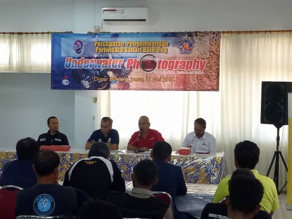 Buleleng, (11/5/2018) -Kegiatan Sosialisasi Fotografi Bahari dibuka oleh Kepala Dinas Pariwisata Kabupaten Buleleng, Ir.Nyoman Sutrisna, MM di ruang Rapat Dinas Pariwisata Kabupaten Buleleng. Beliau memaparkan "berbagai bentuk potensi dan penghargaan yang telah ditemukan dalam bentuk wisata Bahari di Kabupaten Buleleng Pariwisata untuk menjamin percepatan pengembangan pariwisata dalam hal ini, membuat foto - foto untuk menggaetwisata Asing atau lokal ke Bali khusus Kabupaten Buleleng"