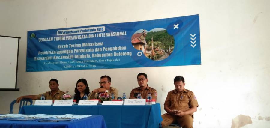 Sekretaris Dinas Pariwisata Kabupaten Buleleng Made Sudama Diana, S.Sos.MM., mewakili Kepala Dinas Pariwisata Kabupaten Buleleng menghadiri serah terima mahasiswa KKN ke Desa Julah, Desa tejakula, dan Desa Bondalem di Kantor Desa Julah. Penyerahan mahasiswa KKN ini bertajuk serah terima Mahasiswa Penelitian Lapangan Pariwisata dan Pengabdian Masyarakat Kecamatan Tejakula, Kabupaten Buleleng, studi kasus Desa Julah dan Desa Bondalem.