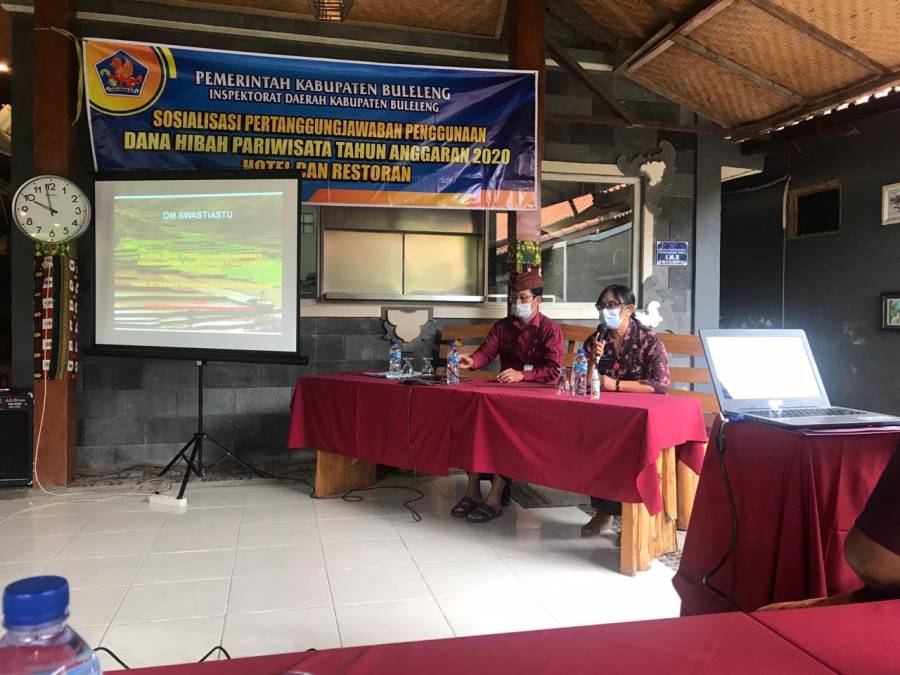 Kepala dinas pariwisata kabupaten buleleng dalam kesempatan ini diwakilkan oleh Kepala bidang industri Putu Suryani SS. menindaklanjuti surat undangan inspektorat terkait sosialisasi pertanggung jawaban penggunaan Dana Hibah Pariwisata Tahun Anggaran 2020 Hotel & Restoran di Kubuku Eco divelodge.