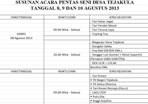 Susunan acara pentas seni desa Tejakula 2013 adalah sebagai berikut :