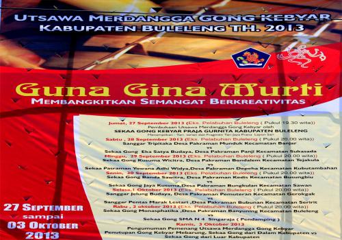 Dalam rangka lebih meningkatkan promosi Obyek dan Daya Tarik Wisata di Kabupaten Buleleng, khususnya guna meningkatkan semangat berkreativitas berbudaya sekaligus mempromosikan kegiatan UTSAWA MERDANGGA GONG KEBYAR Kabupaten Buleleng Tahun 2013, mari kita saksikan bersama pagelaran akbar Gong Kebyar se-Buleleng pada,