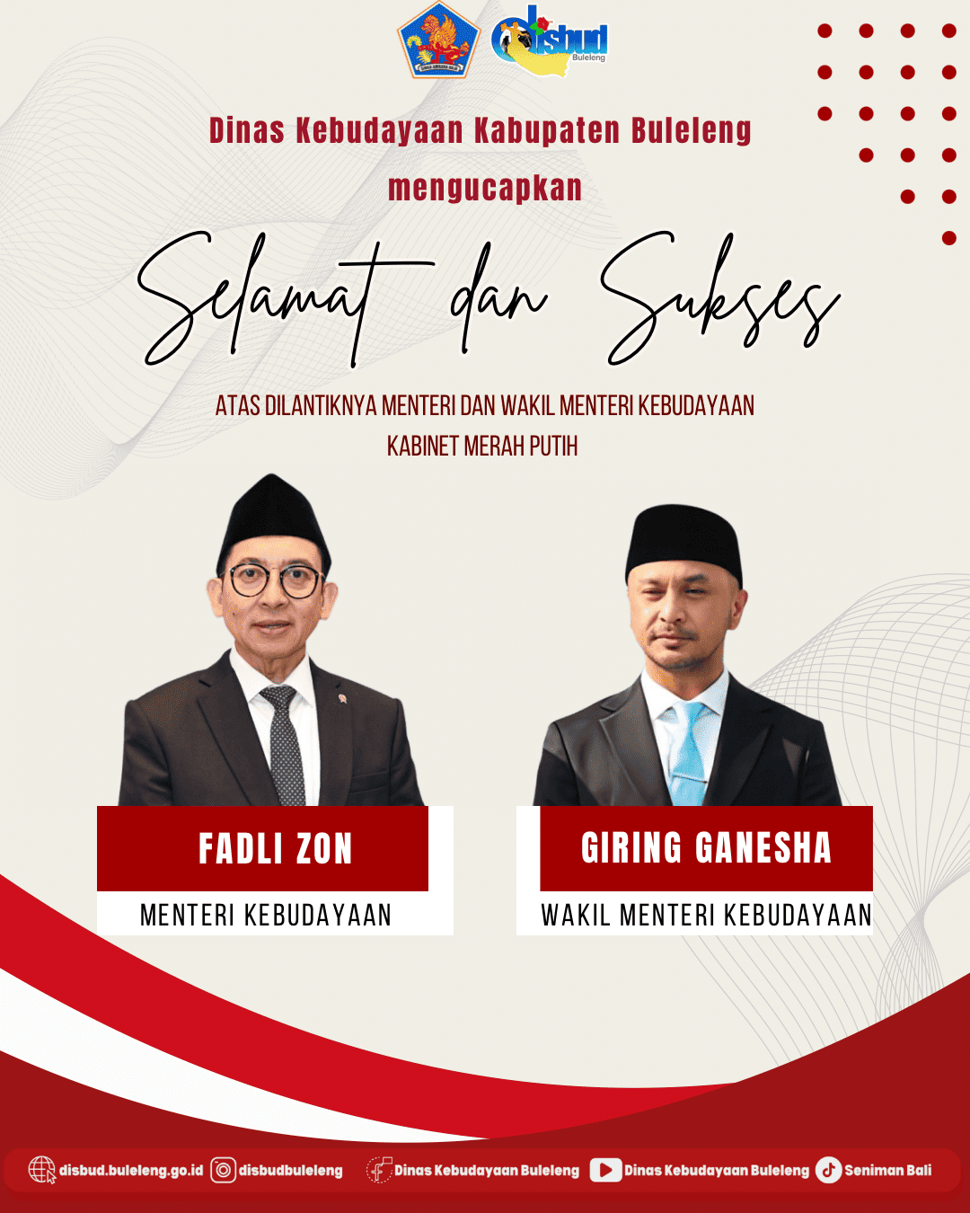 Dinas Kebudayaan Kabupaten Buleleng mengucapkan selamat dan sukses atas dilantiknya Menteri dan Wakil Menteri Kabinet Merah Putih ????????
