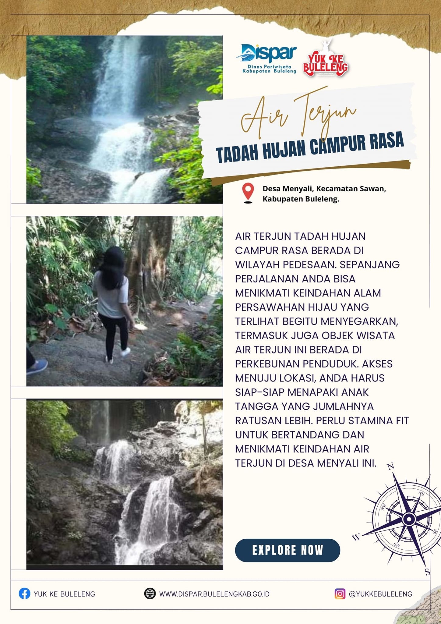 Air terjun Menyali ini berasal dari dua sumber sungai yang berbeda yaitu sungai Menyali dan sungai Sangsit. Kedua sungai tersebut bertemu pada satu titik, sehingga dinamakan campuhan. Tempat pertemuan dua sumber air tersebut baik itu pertemuan antara dua aliran sungai. Pertemuan aliran air sungai dengan laut memang memiliki nilai sakral dan sering digunakan sebagai tempat melukat. Begitu juga halnya di air terjun ini, nama campuhan akhirnya menjadi Campur Rasa juga memiliki nilai sakral dan juga sebagai tempat melukat (meruwat).