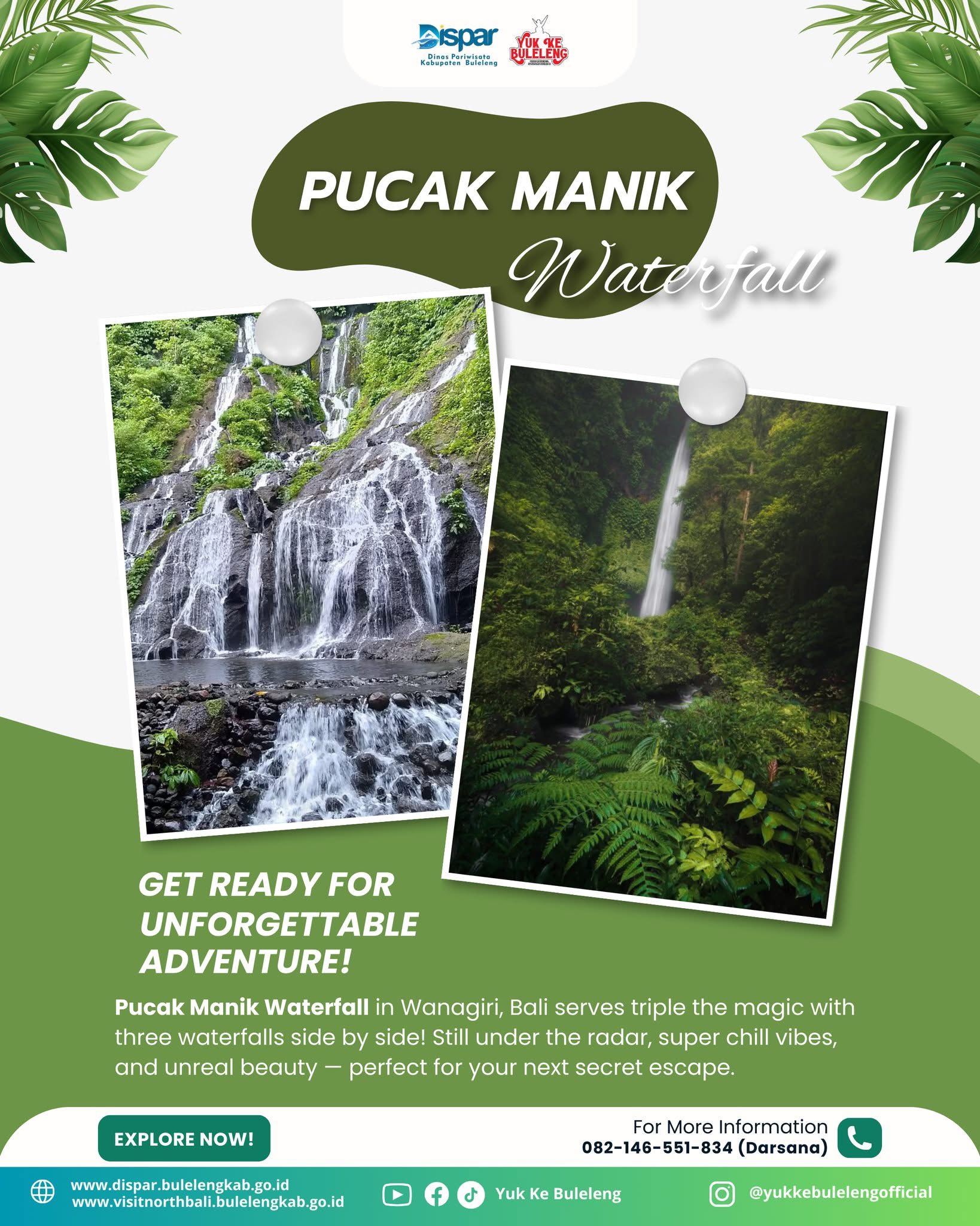 Air Terjun Pucak Manik tuh tempat kece di Bali buat ngunjungi tiga air terjun sekaligus yang lokasinya sebelahan! Ada di Desa Wanagiri, Sukasada, Buleleng. Cocok banget buat yang demen main ke air terjun. Tempat ini masih baru, jadi belum rame, pas buat yang mau cari suasana tenang. Walaupun belum sepopuler air terjun lain di Bali, tapi keindahannya nggak kalah, Sob!