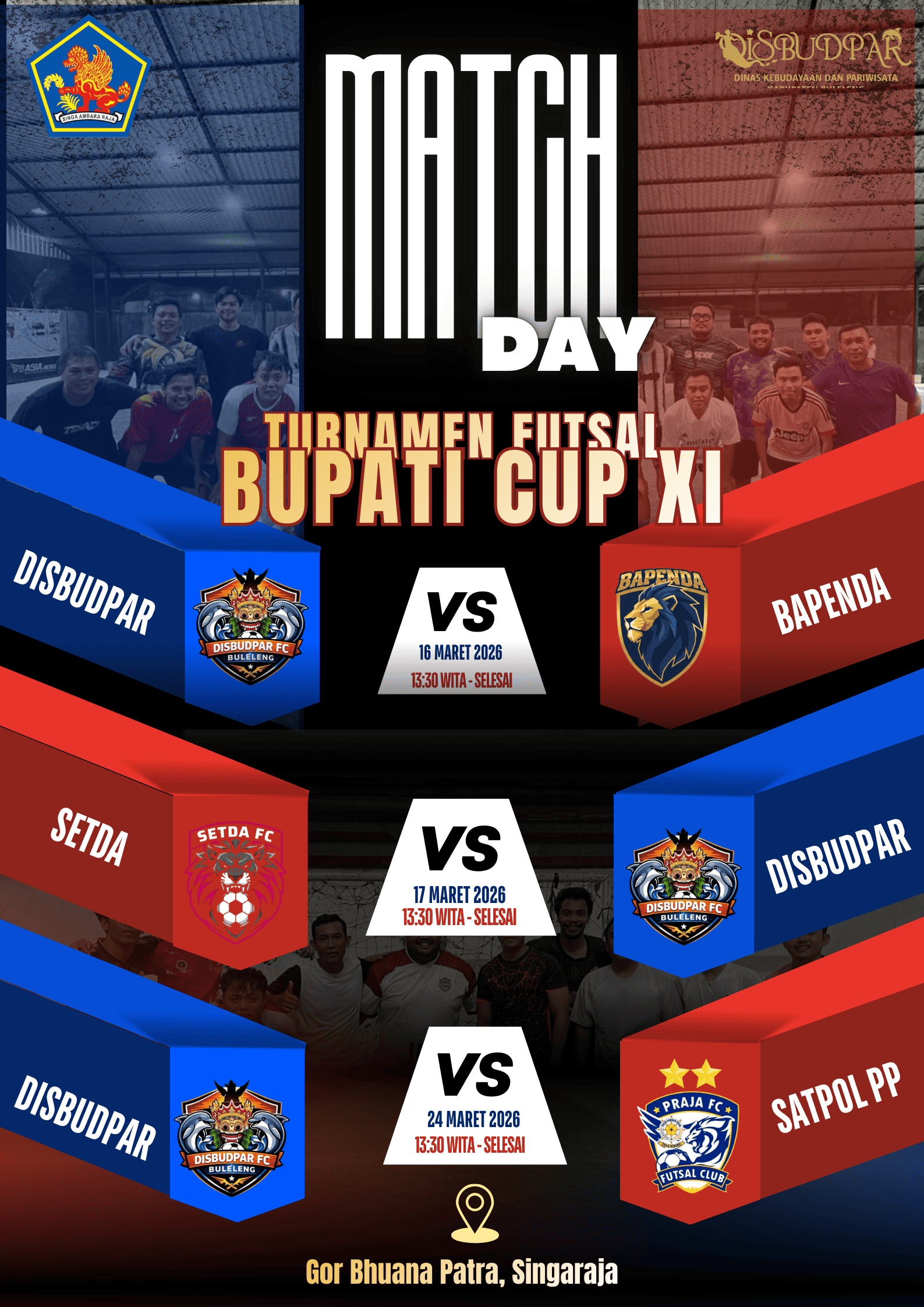 *DUKUNG DAN SAKSIKAN!*TURNAMEN FUTSAL BUPATI CUP XIIni saatnya kita bersatu! DISBUDPAR, jaya, jaya, jaya Gor Bhuana Patra, SingarajaJangan Lupa bawa atribut terbaikmu, dukung tim Disbudar#Futsal#Turnamenfutsal#BupaticupIX#Hutkotasingaraja